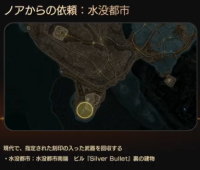 | ノア依頼を受けて戦うクエスト ■水没都市 ![]() ビルの裏の建物 水没都市の南にある廃墟の建物の中に刻印武器が落ちている ![]() 西海岸の桟橋のポイントから南東に進んでいくと目標地点付近にビルがある SILVER BULLETと書かれた看板の近くのビルの裏に向かう 裏からビルの中に入る |