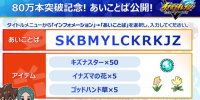 ![]() あいことば SKBMYLCKRKJZ 獲得できるアイテム キズナスター×50、イナズマの花×5、ゴッドハンド草×5 |