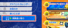 | あいことばについて ●あいことばの入力 タイトルメニューから「インフォメーション」を選択。 ![]() あいことばを選択 ![]() あいことばを入力する 入力に成功すると、「特典受け取り」メニューに特典が追加され、受け取りが可能になります。 ![]() |