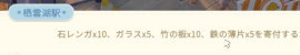 石レンガ×10、ガラス×5、竹の板×10、鉄の薄片×5